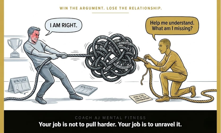 Fischer teaches the opposite: instead of seeing arguments as something to win, see them as something to unravel. There are knots in the conversation, knots in the communication. Your job isn't to pull harder. It's to ask, "Help me understand. What am I missing?"