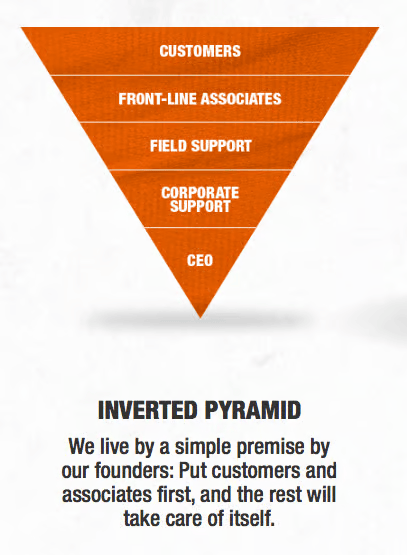 In most organizations, power flows top-down. In great teams, leaders serve from the bottom up. Frank Clark, the former CEO of Home Depot, mastered the inverted pyramid model. This “inverted pyramid” model means: